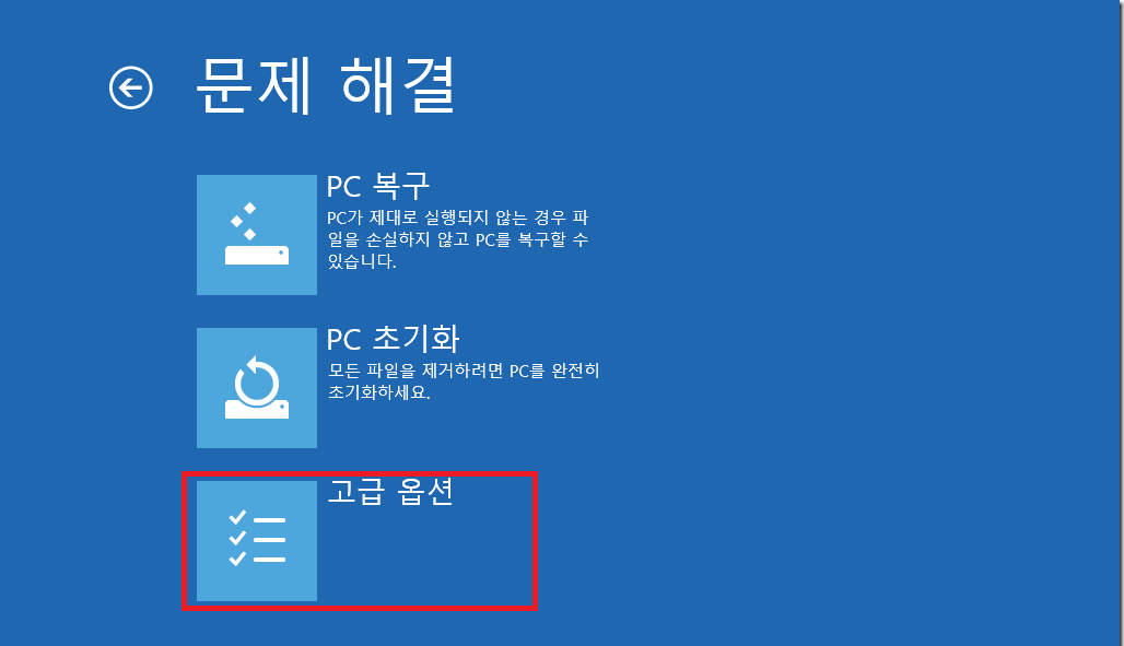1. "설정> 윈도 업데이트 및 보안 " 으로 이동하겠습니다. 왼쪽 메뉴에 "복구"가 있습니다. 클릭합니다. 해당 페이지에서 "고급 시작 옵션> 지금 다시 시작"을 클릭하면 복구 이미지를 선택할 수 있는 페이지로 넘어갑니다. 주의사항은 Windows를 재시작하니 함부로 누르지 마십시오.